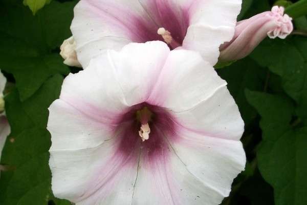 牵牛花有六十多个品种,常见的有三种。第一种是裂叶牵牛,叶片三裂,花中型一到三朵腋生,第二种是圆叶牵牛,叶片阔心脏形,花型比较小,第三种是大叶牵牛,叶大柄长,叶片三裂,中央裂片比较大,花型比较大。